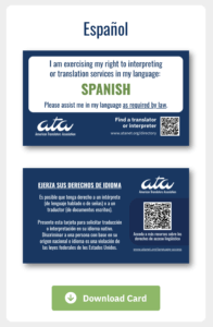 The card is designed so that LEP individuals can carry it in their wallets or on their phones. The front of the card indicates to the English-speaking provider or recipient of the card what the LEP is requesting, in what language, and how to find a translator or interpreter easily in ATA’s online Language Services Directory.