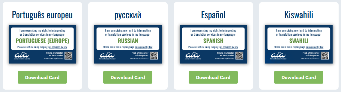 ATA will promote the cards on its social channels in the near future and welcomes any support to spread the word to LEP individuals. Olivia shares that “continuing to ask for language access in various settings, as well as proving that there are providers ready and able to facilitate it, is a good reminder to institutions that this is a vital need and should be a fundamental right.”